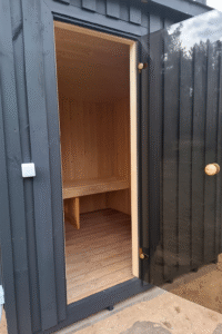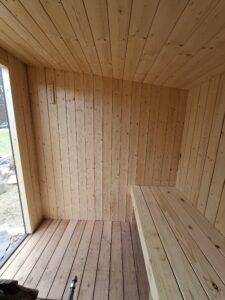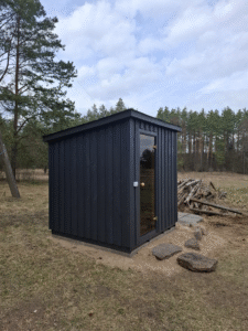 Mažiausios gaminamos pirties vidaus dydis: 2,00 m x 2,00 m, aukštis – 1,80-2,00 m.